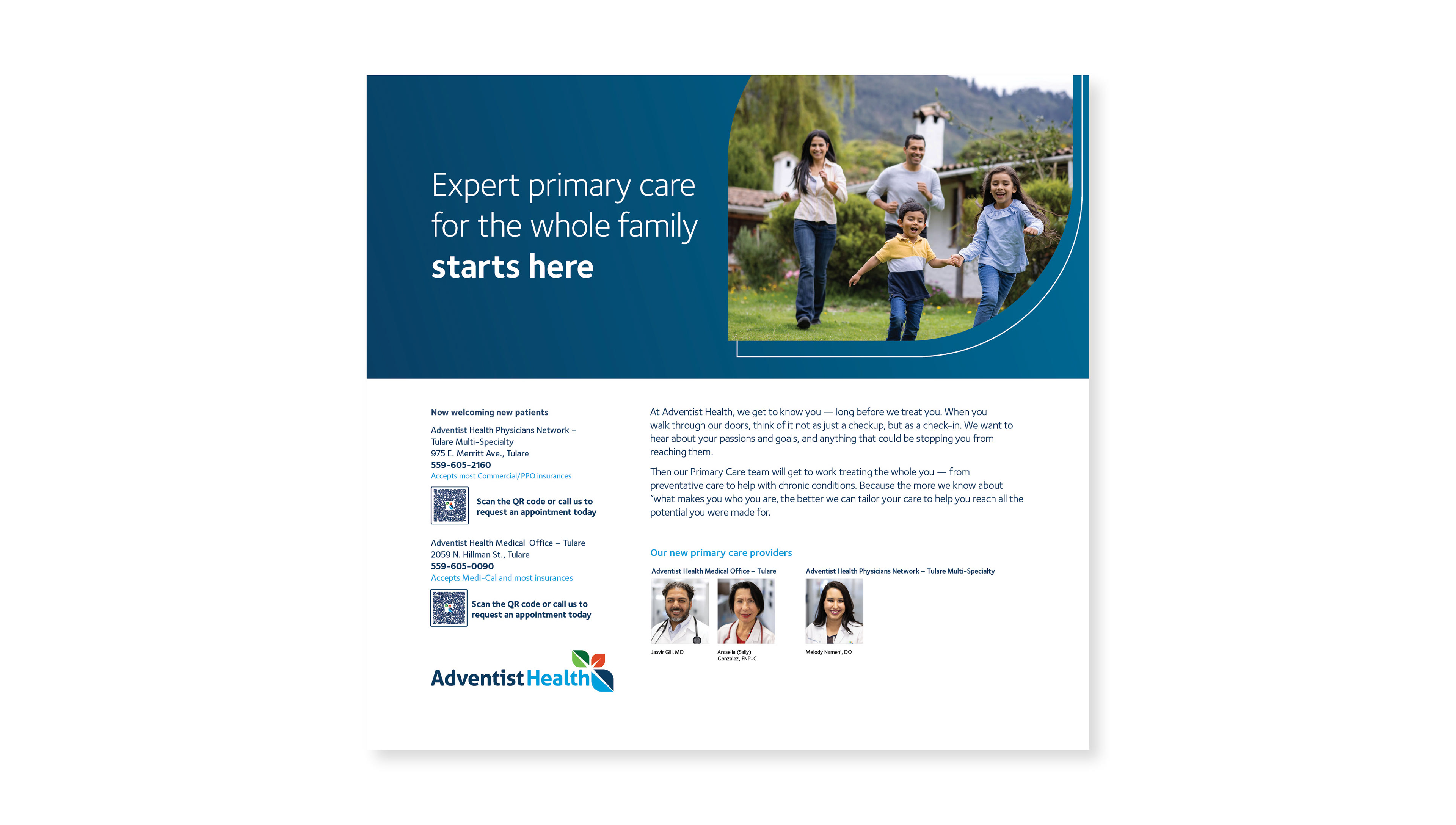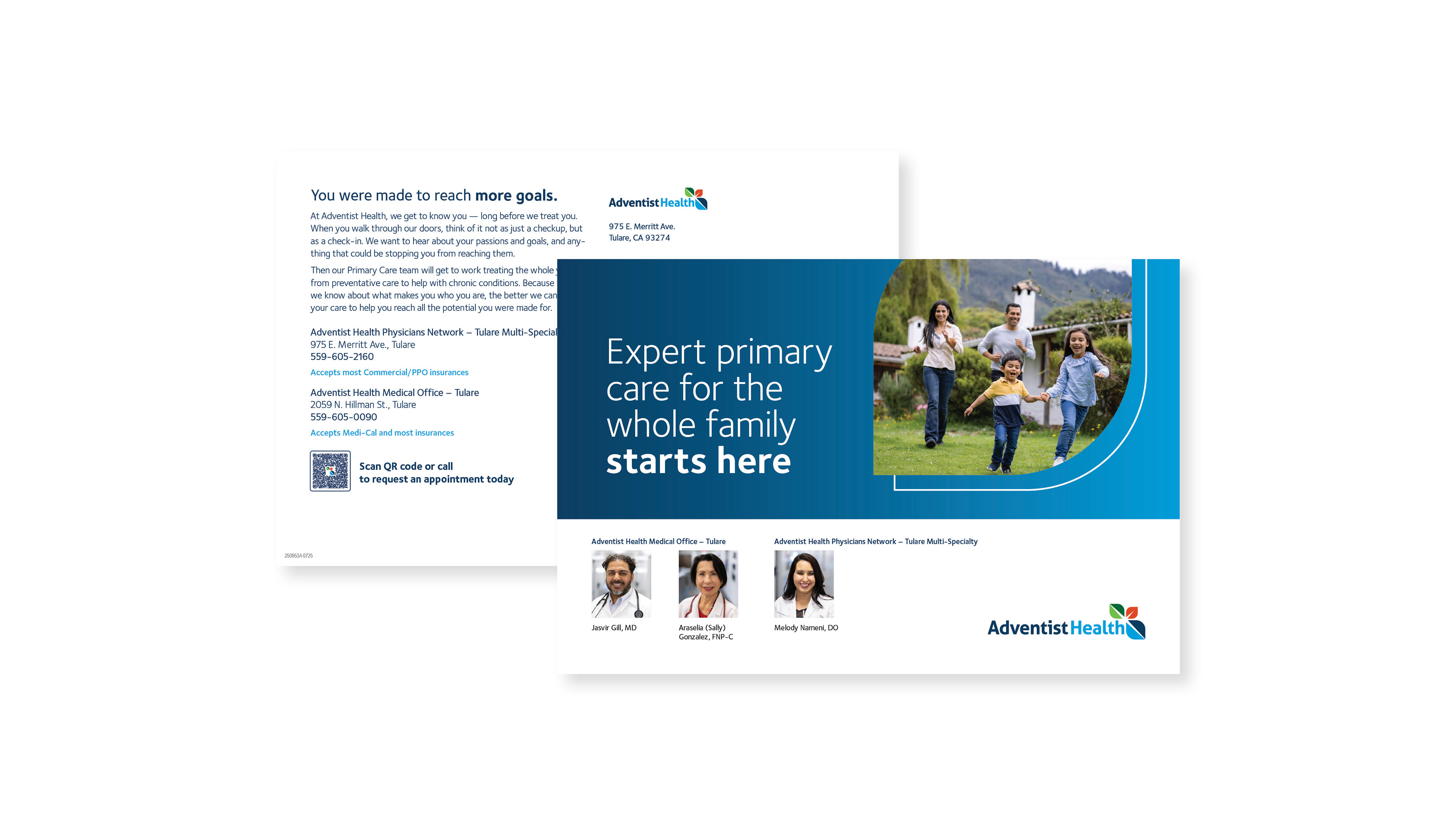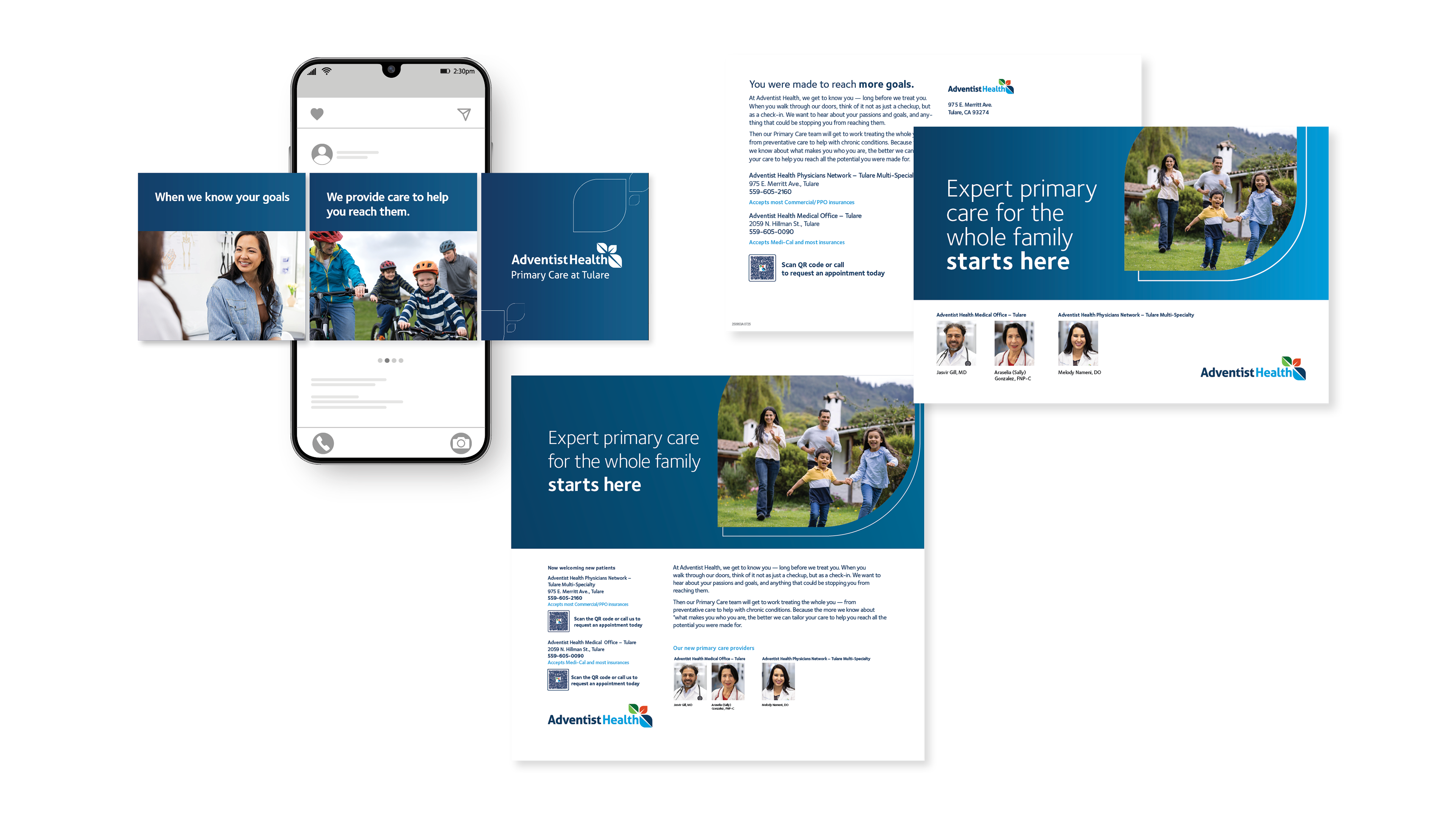 This integrated campaign was created for Adventist Health as part of the Made for More 3.0 brand rollout, highlighting Primary Care services in the Tulare region. The campaign included a print ad, social media post, and direct mail piece, all designed within the Made for More 3.0 brand standards for visual and message alignment. The creative approach aimed to increase visibility among Tulare consumers and reinforce Adventist Health’s commitment to whole-person, accessible care.