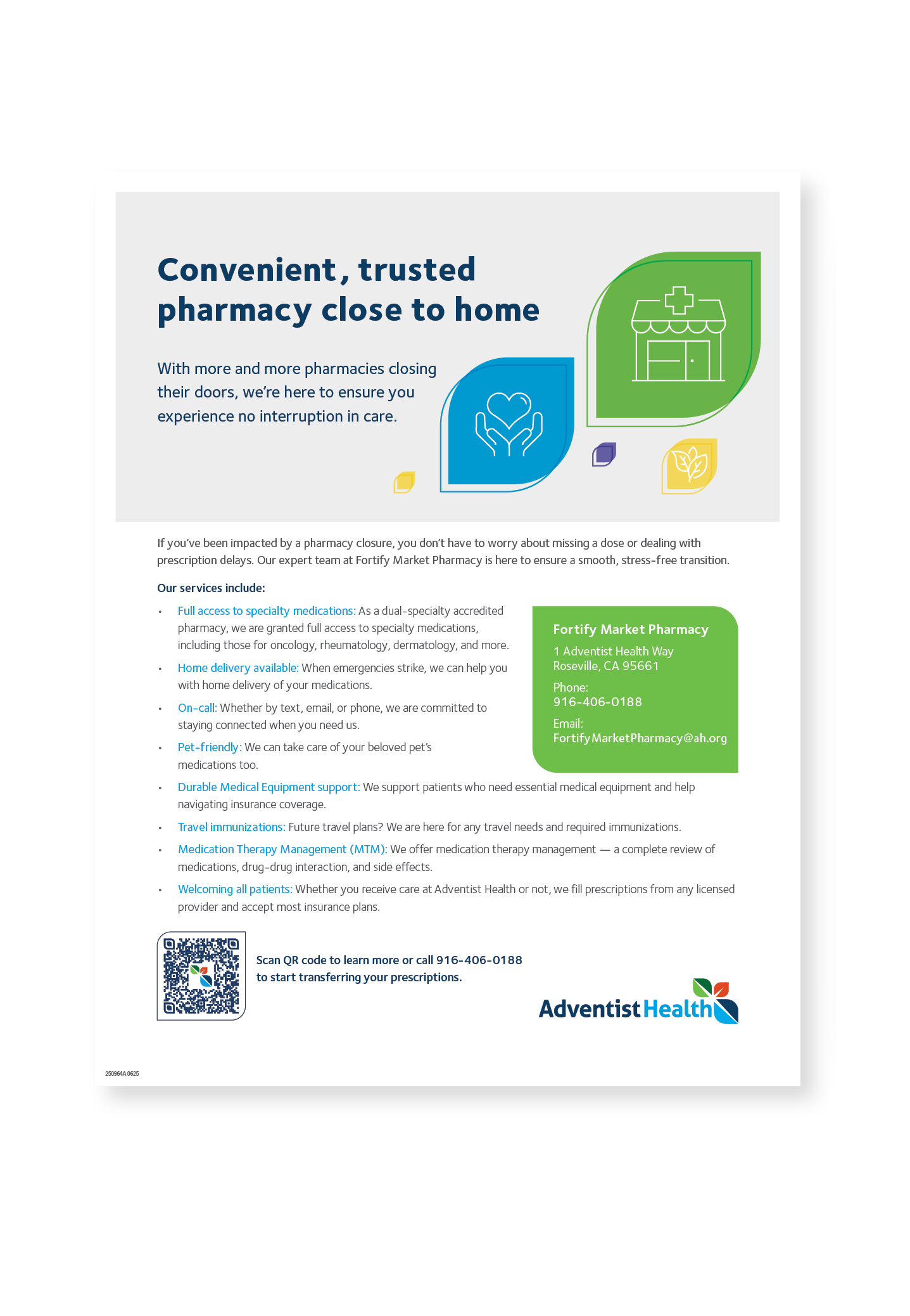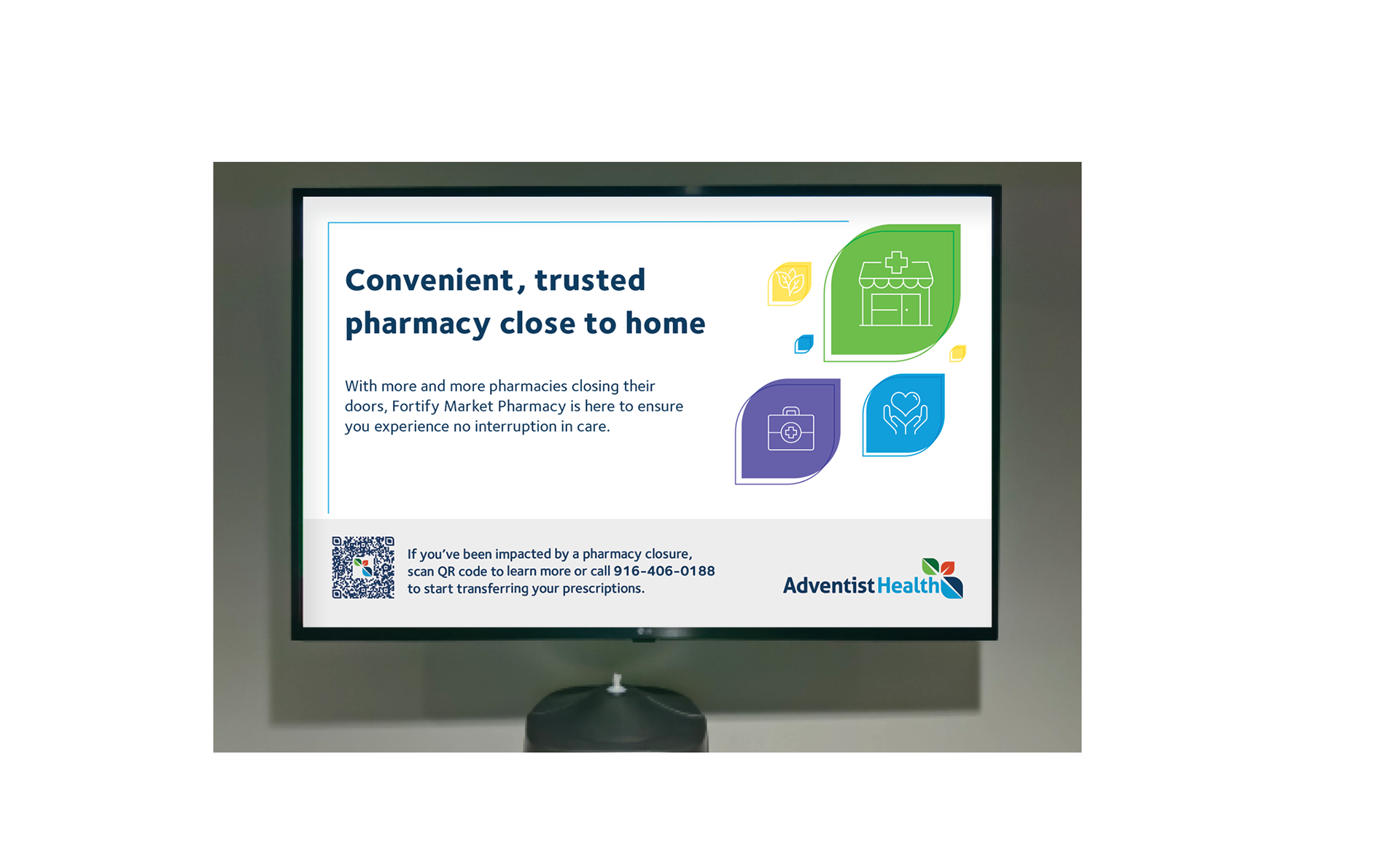 I designed a set of bold, print and social media assets to spotlight Adventist Health local pharmacy services as a trusted, convenient community-based alternative—intentionally crafted to stand out from evergreen campaigns and respond to recent pharmacy closures.