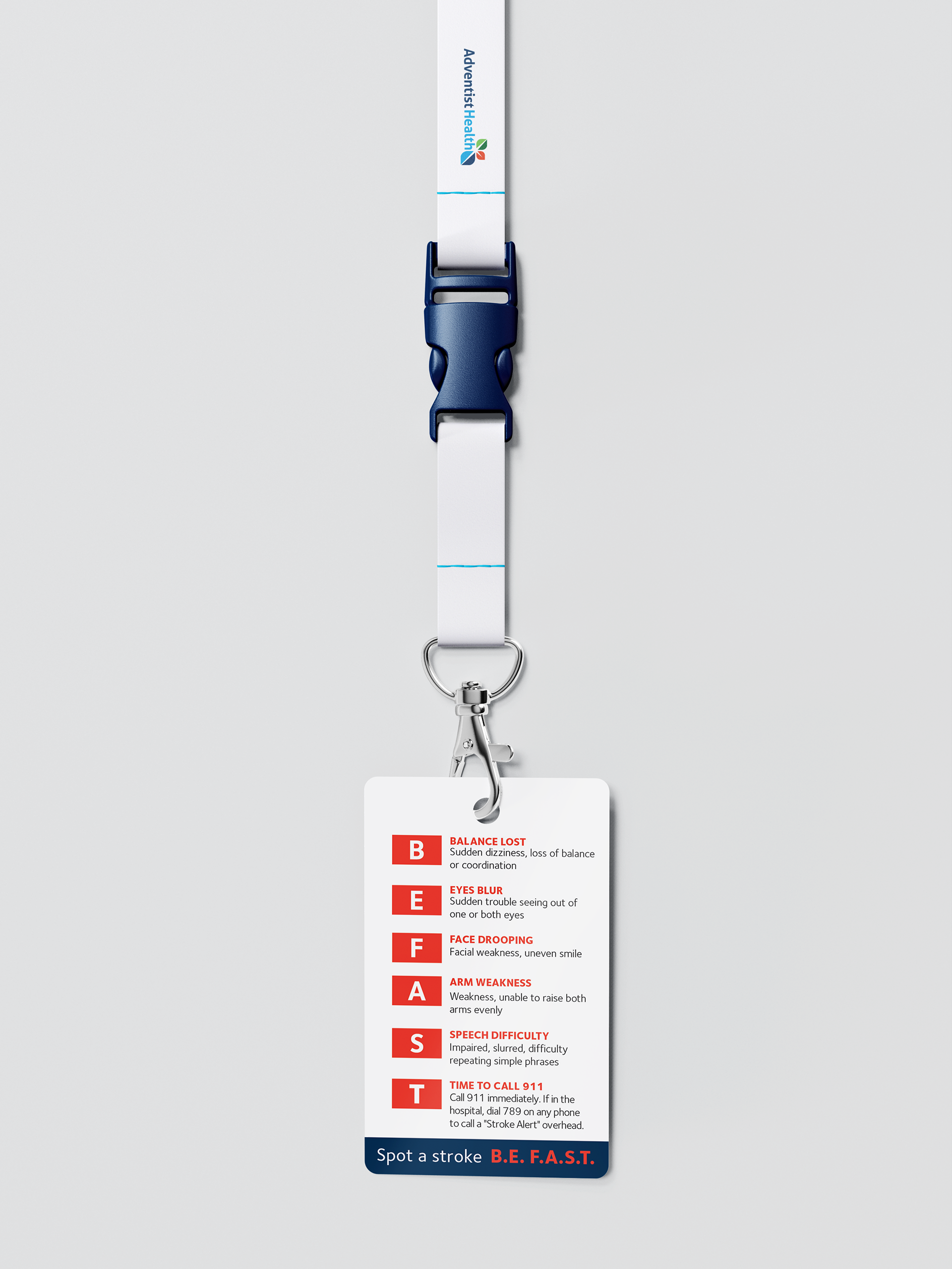 Created for Adventist Health, this project supports the Quality team’s initiative to help clinic associates quickly identify the warning signs of stroke and heart attack. The double-sided badge buddy features clear infographic-style illustrations paired with key symptom descriptions for fast, easy reference during patient interactions.
